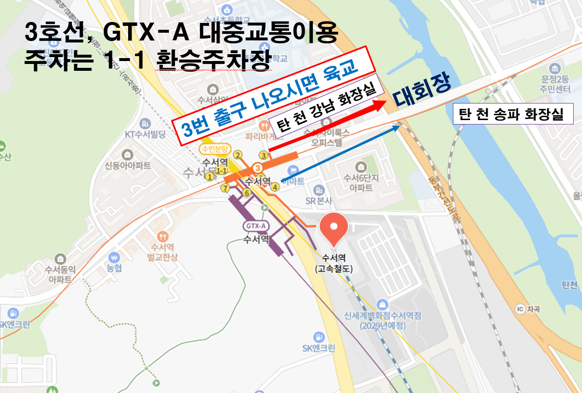 3,4번 출구 도보 3~4분 거리 화장실은 행사장 옆과 견너편에 있습니다. 산불조심 참가자가 많아 더 발전합니다.
